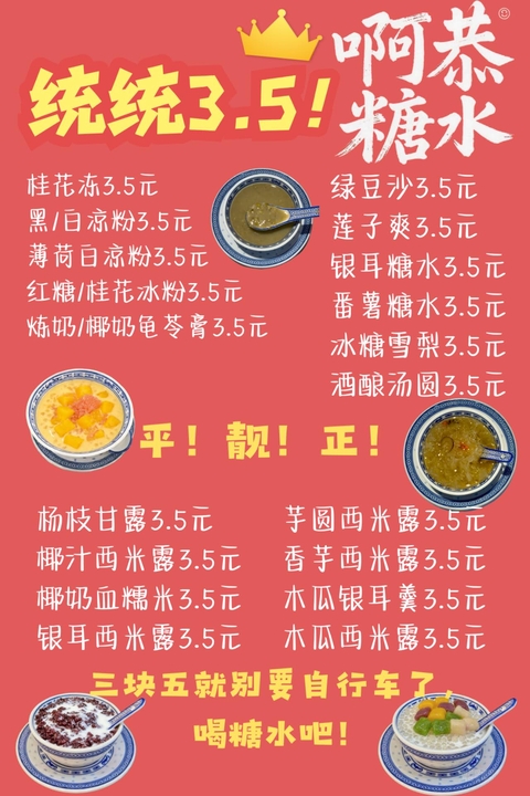 啊恭糖水,由00后连州本地人返乡创业打造,主打3.5元一碗的实在糖水,用亲民价格、真材实料,守护连州街坊的日常甜意。坚持每日现熬、食材新鲜,不糊弄、还原传统糖水本味;现无需会员、到店即享3.5元一碗,打包免费,性价比拉满。